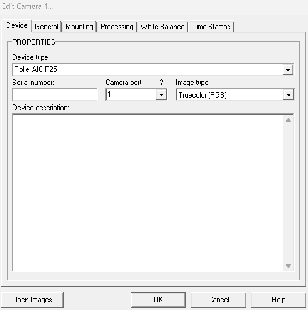 We will add an A7R4 camera. The device type is only a label, so select the Rollei camera:
