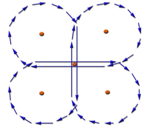 A calibration mission plan should include at minimum 2 sets of opposing flight-lines, intersecting each other perpendicularly. After you fly the first flight-line, only make right hand turns, which will result in the cloverleaf pattern shown in Figure 1 and Figure 2 below. Take care to ensure that the helicopter is flying straight and level through the intersection, and straight and level at least 100 meters before and after the intersection point. Flying the same pattern again at a different altitude will improve results.