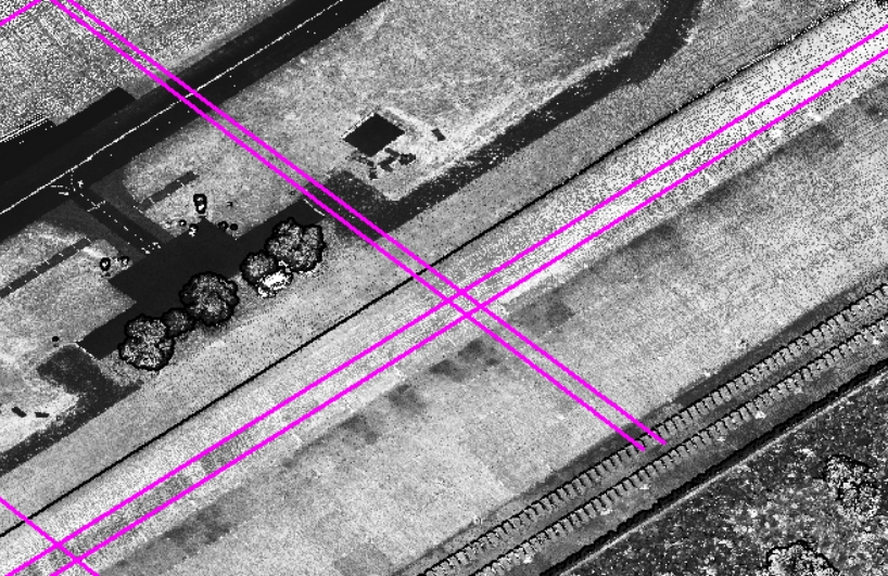 The calibration site should contain primarily hard surfaces and be free of vegetation. Flat, pitched structures, such as angled roofs and concrete structures, help the LiDAR optimization routine determine the alignment of the sensor, so it is important to pick a flight location with several buildings or structures. A well defined ground surface per each discrete flight-line will also allow for improvements in sensor alignment.