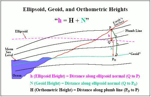 A geoid is a model of global mean sea level that is used to measure precise surface elevations in “Orthometric Heights”. The geoid surface is irregular, unlike the reference ellipsoid, but is considerably smoother than Earth's physical surface. Orthometric vertical datums reference a geoid model. Geoid Models include undulating offsets known as “Geoid Heights” (represented as “N” in the above image under Vertical Datum) or the difference between an Ellipsoid Height and an Orthometric Height.