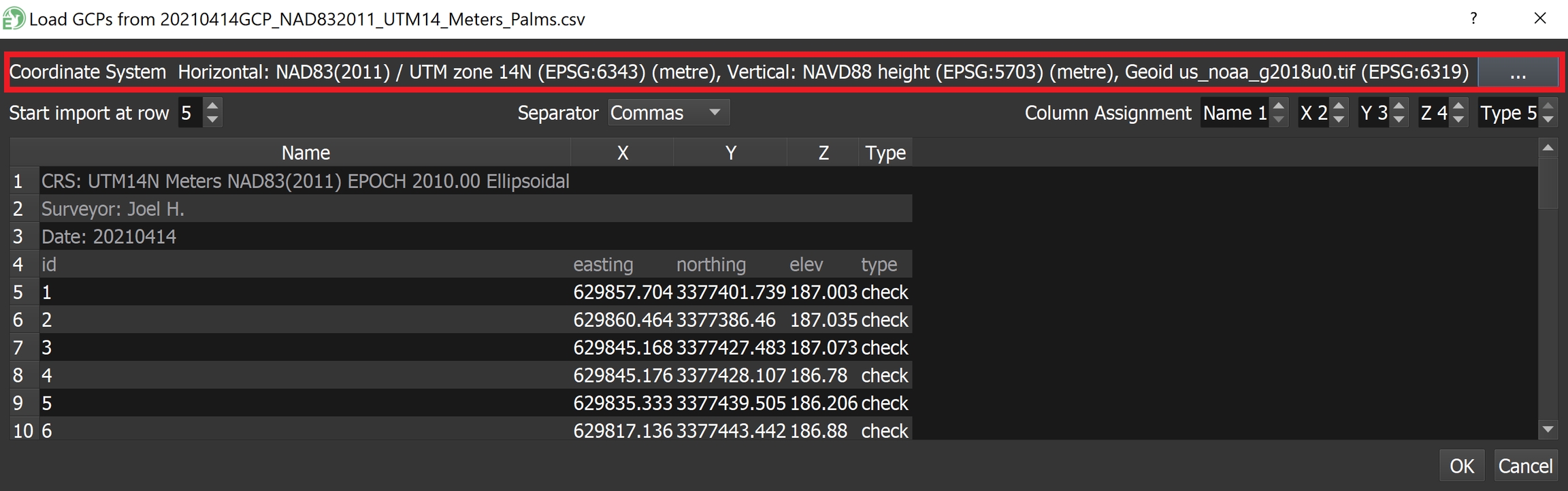 When importing GCPs into Spatial Explorer, Select the Horizontal CRS as "NAD83(2011) / UTM zone 14N" with units set to "metre" and select the Vertical CRS as "NAVD88 height" with units set to "metre".