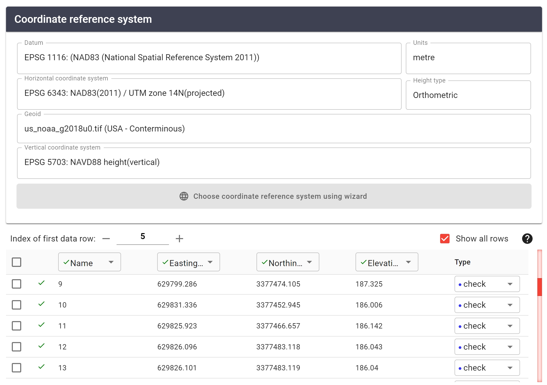 Next, select the Horizontal coordinate system "NAD83(2011)/UTM zone 14N" (Datum and Map Projection) and NAVD88 (orthometric vertical datum) as the vertical coordinate system + GEOID18 (Geoid model)
