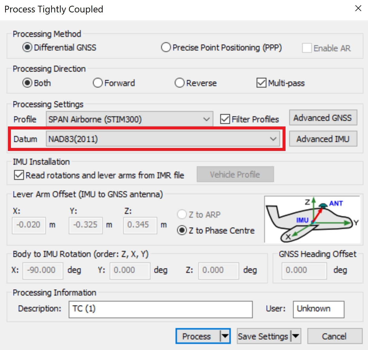 In Inertial Explorer, select the datum "NAD83 (2011)" during the tightly coupled trajectory processing step