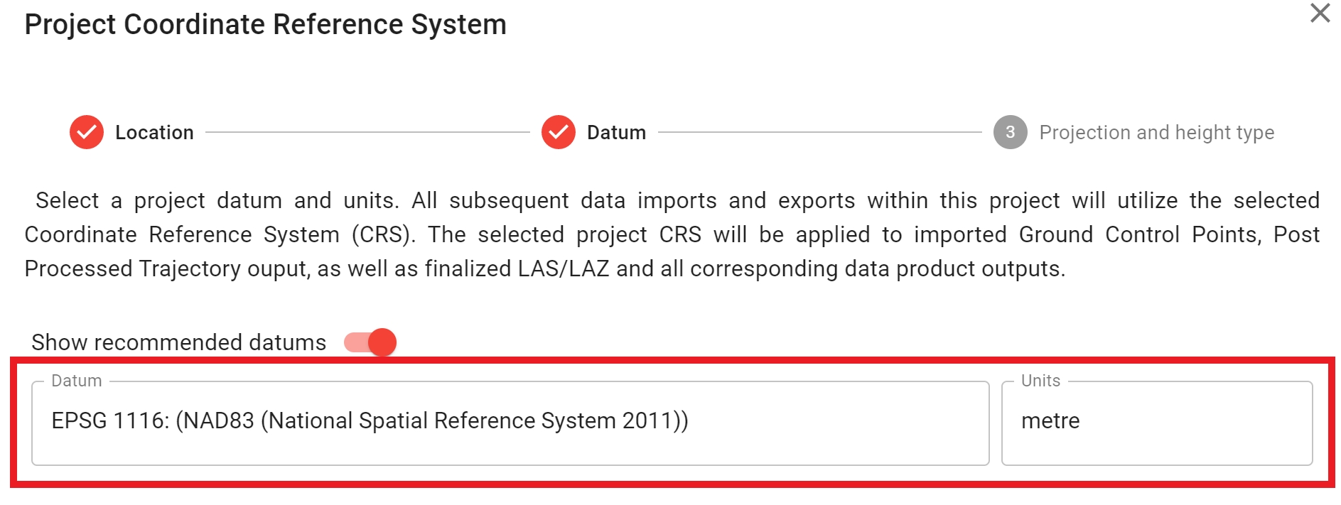 During project creation, select "NAD83 (2011)" as the project datum and select "Metre" for the project units.
