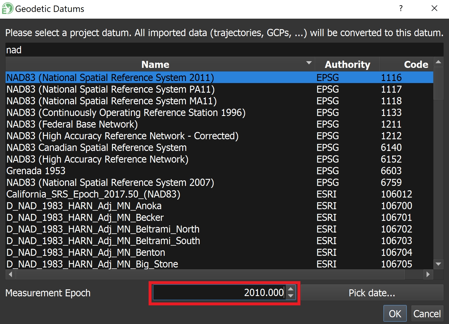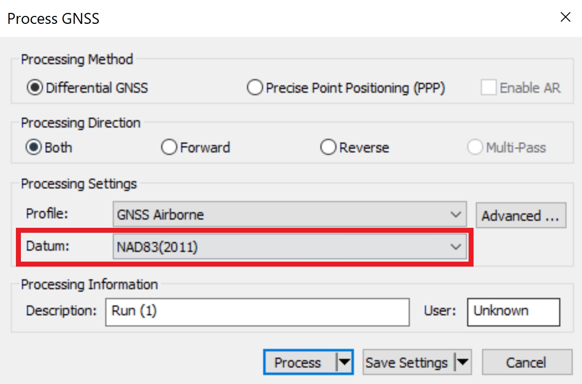 In Inertial Explorer, select the datum "NAD83 (2011)" during the GNSS trajectory processing step