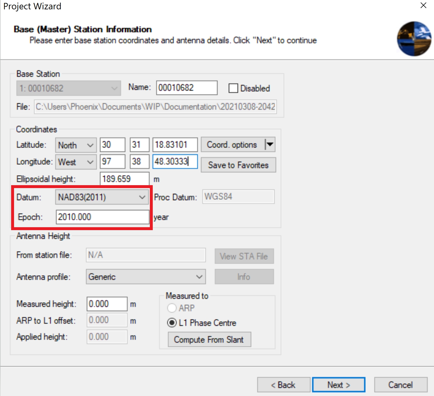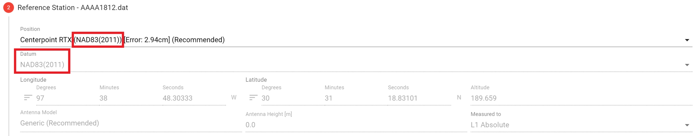EXAMPLE 1: Static Horizontal Datum with Orthometric Vertical Datum using RTX Refined Reference Station Coordinates (@ L1 Phase Center)