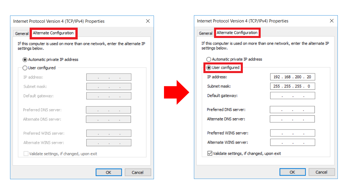 6. Click on the alternate configuration tab and select the “User configured” option. Enter the IP address 192.168.200.20 (for ethernet) or 192.168.101.10 (for M12) in the IP address field box and subnet mask address 255.255.255.0 in the Subnet mask field box.