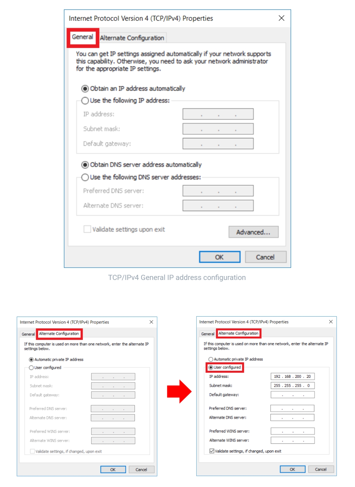 Any computer with a properly configured ethernet adapter can be used to establish a direct connection to the rover using an ethernet cable. Field computers configured by Phoenix LiDAR Systems will default to an alternative IP configuration of 192.168.200.20 when no IP address is obtained through DHCP on the primary ethernet port within 3 minutes. This will allow a computer to establish a connection to the rover via ethernet after 3 minutes of connection. Refer to Wired Ethernet Network Card Setup for more information.