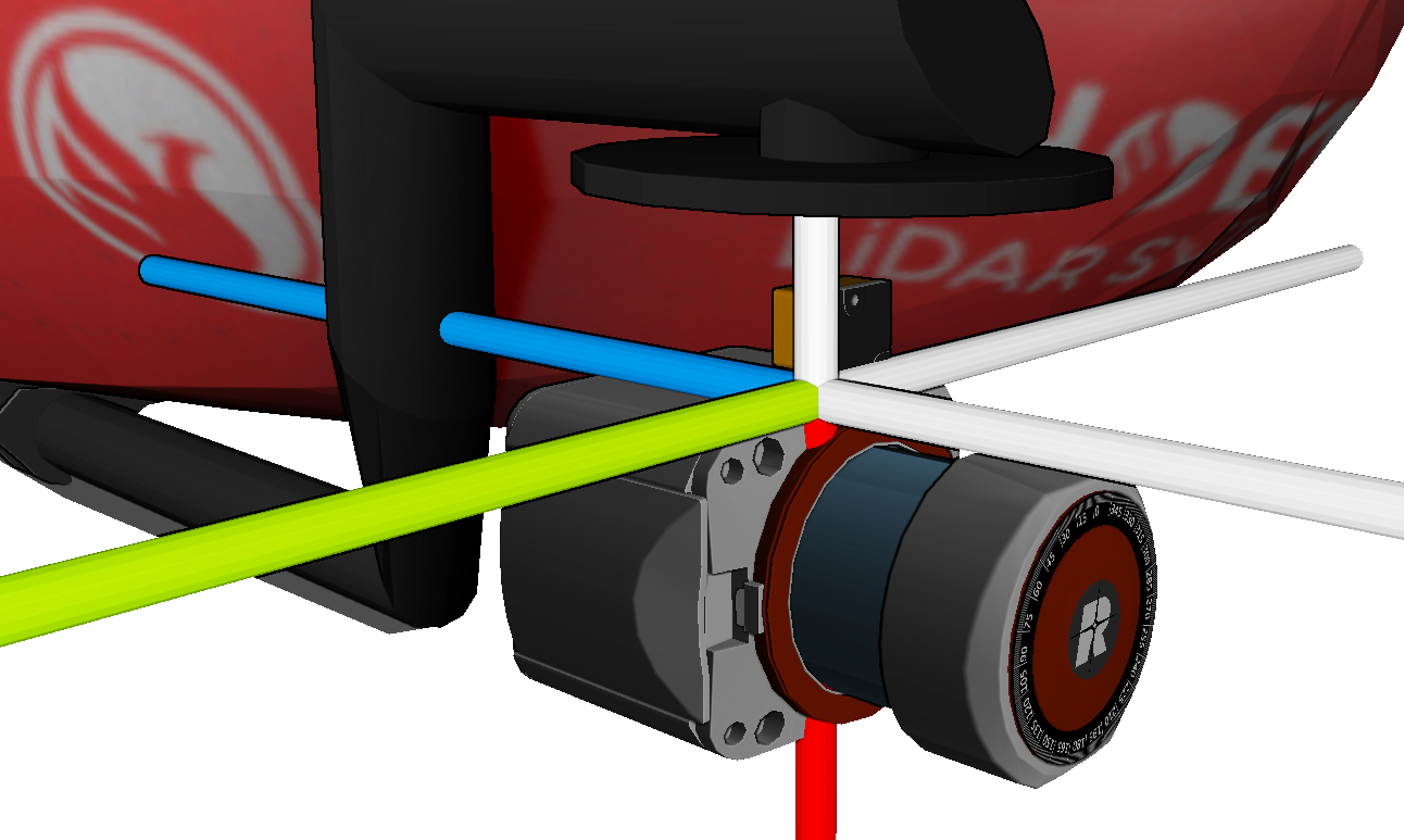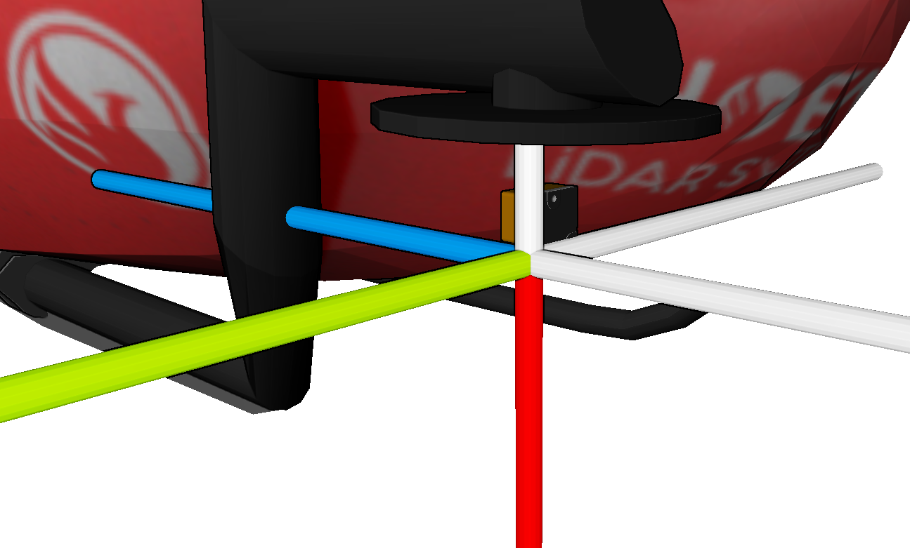 A LiDAR sensor was added with a translation of 0/0/0, so its optical center coincides with the IMU's center of navigation. That is of course mechanically impossible (or at least a very expensive exercise). Since the LiDAR's rotation values are all zero, its axes (as specified by the manufacturer) align with the IMU axes. That's not correct either.