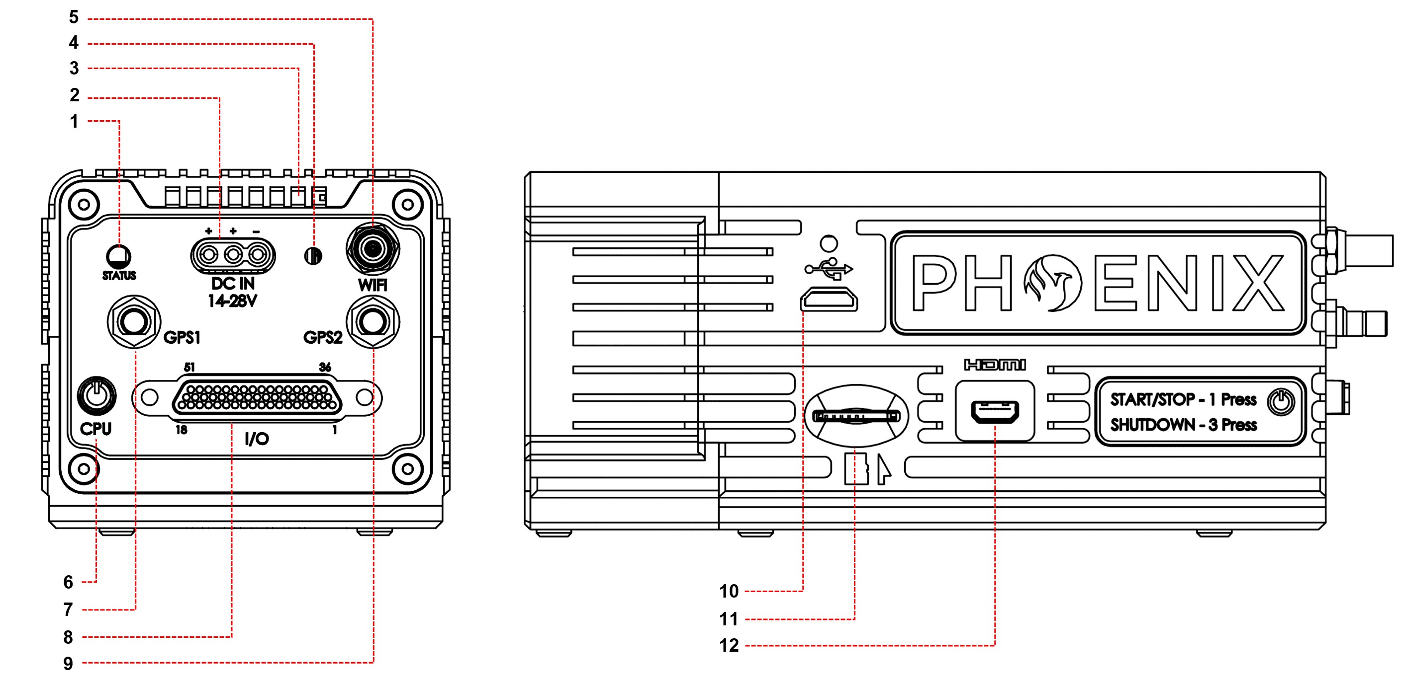 * Run the wiring harness, This will include a power cable that connects to the Nav box and an ethernet cable connection to the LiDAR. If you are also running a ladybug 360-degree camera you will run that cable and connect it to the appropriate connection on the Nav box as well. For the Air nav box this will be a cable coming from the 51-pin connection (see #8 on the first tab below). For the FLEX This will be the Ethernet LEMO connection and the Camera LEMO connection (see #2 and #5 on the second tab below):