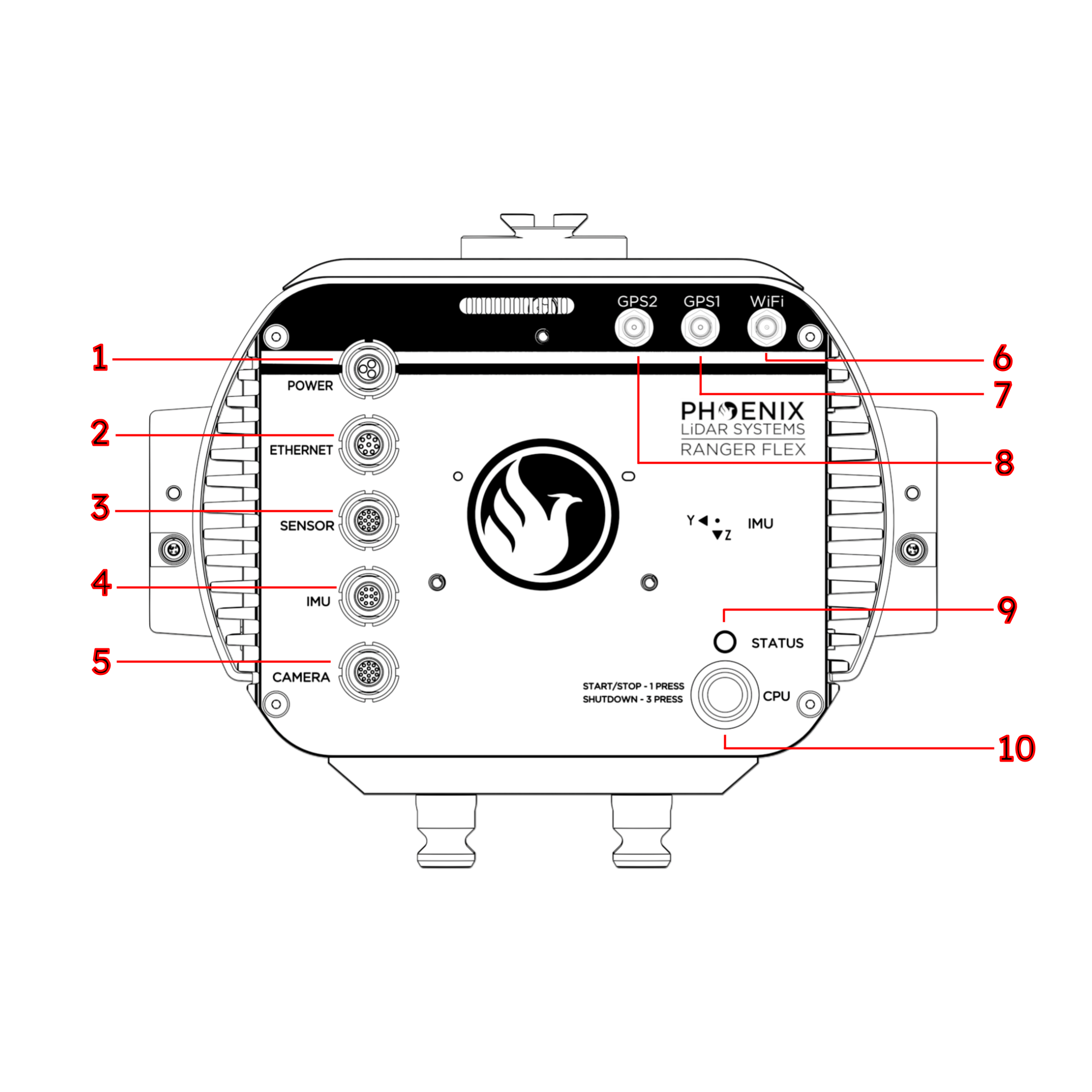 <figure><img src="https://2222094320-files.gitbook.io/~/files/v0/b/gitbook-x-prod.appspot.com/o/spaces%2FdEevfLZRIk38LUPwDa4V%2Fuploads%2Fm4Hd5HEUCyB0F7ft9GQr%2FFLEXPack%20Front%20(1).png?alt=media&#x26;token=3809b053-9b08-4dac-a1bc-b462ab805cf2" alt=""><figcaption><p>Connection Ports and User Elements on Front of the Phoenix LiDAR FLEXPACK NavBox</p></figcaption></figure>