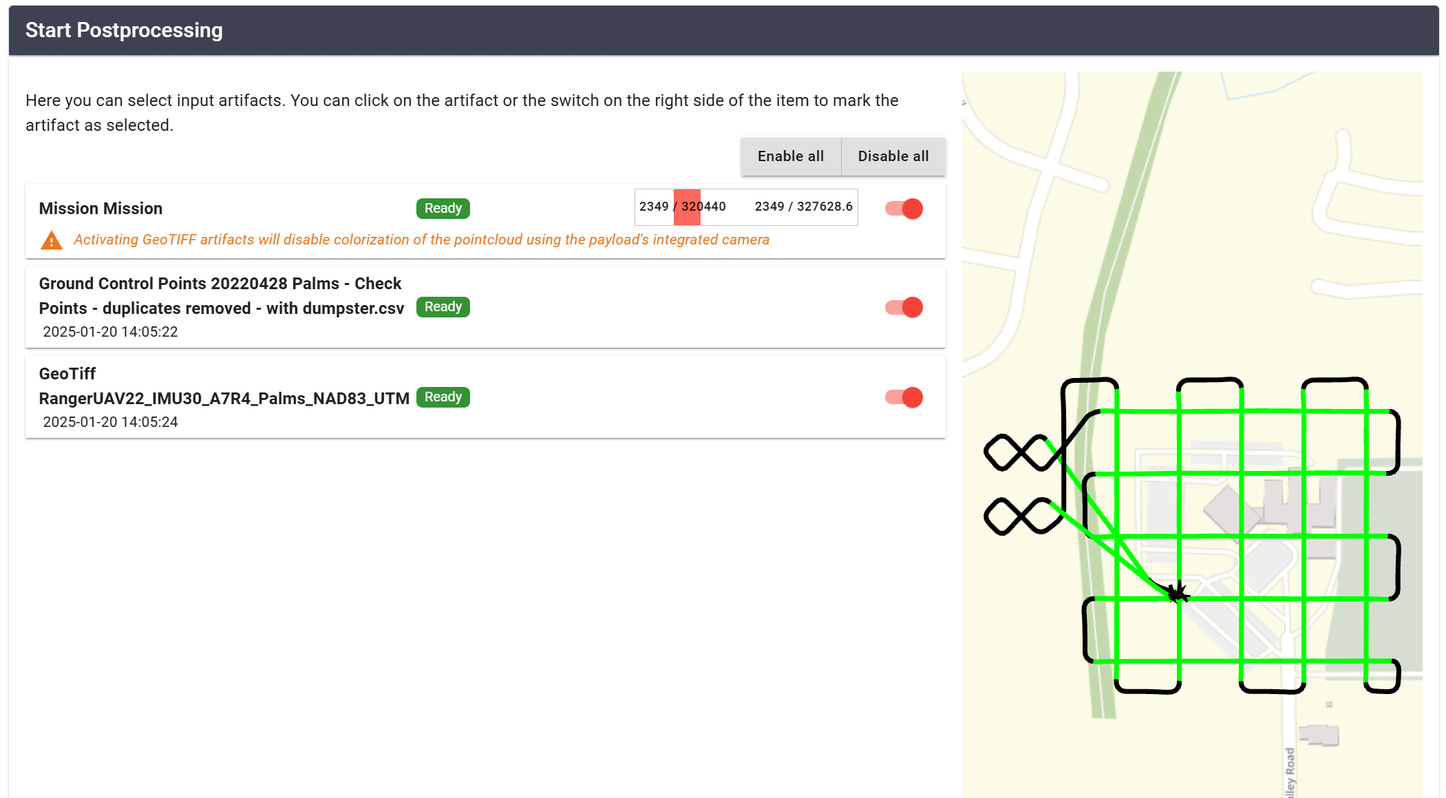 To colorize a pointcloud using a GeoTIFF, start by uploading the GeoTIFF under the Documentation tab in the project. This will automatically create a pipeline called "GeoTIFF optimization." When creating a SpatialFuser pipeline, ensure the GeoTIFF is enabled on the file selection screen. Doing so causes the camera options to disappear from the configuration steps on the next screen and enforces LiDARMill to use the GeoTIFF for colorization instead of the images.&#x20;