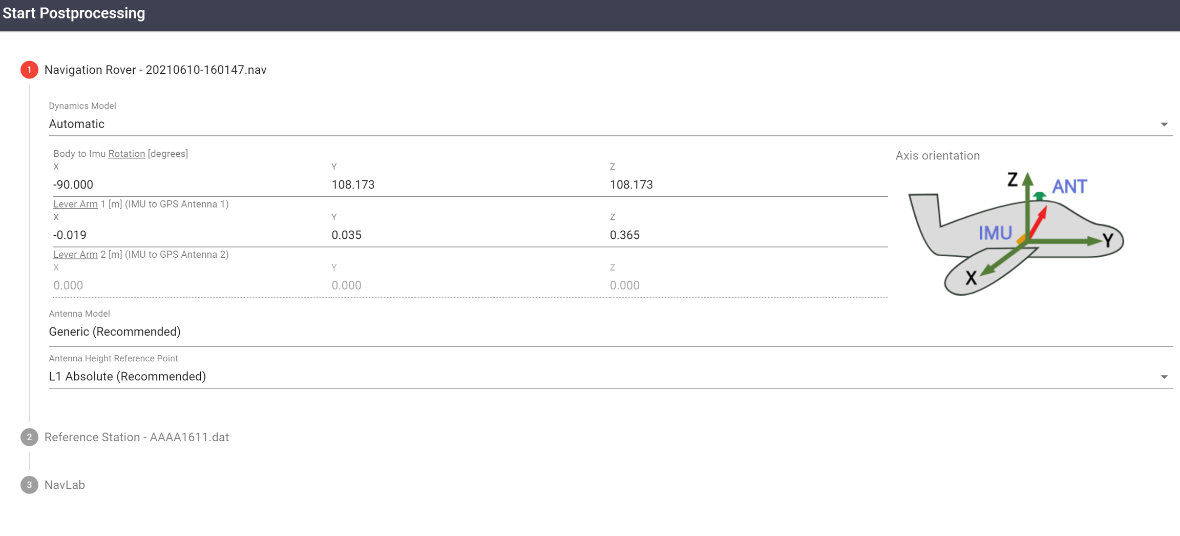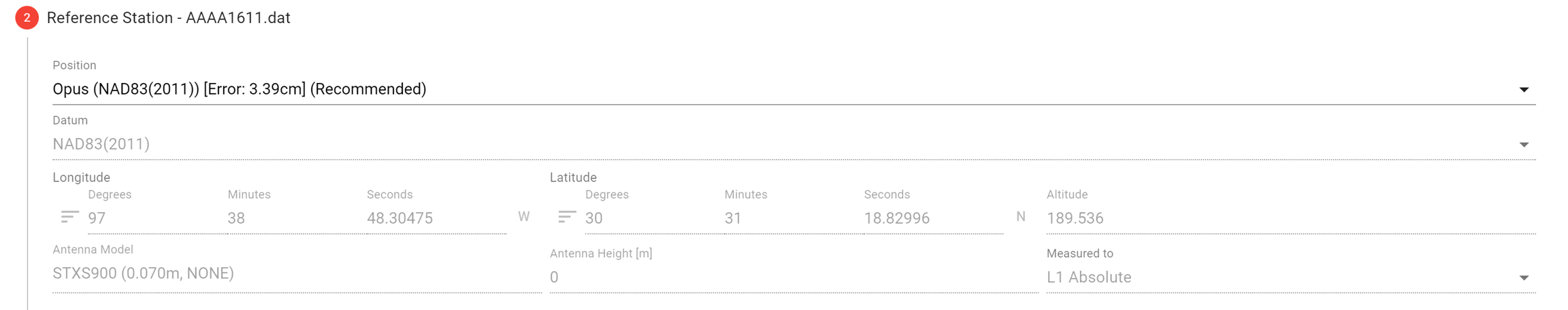 Inputting correct reference station position is a very important step in trajectory post processing. Select from the available post processed positions in the drop down menu, or enter your own "Custom" position if you positioned your reference station over a known ground point.