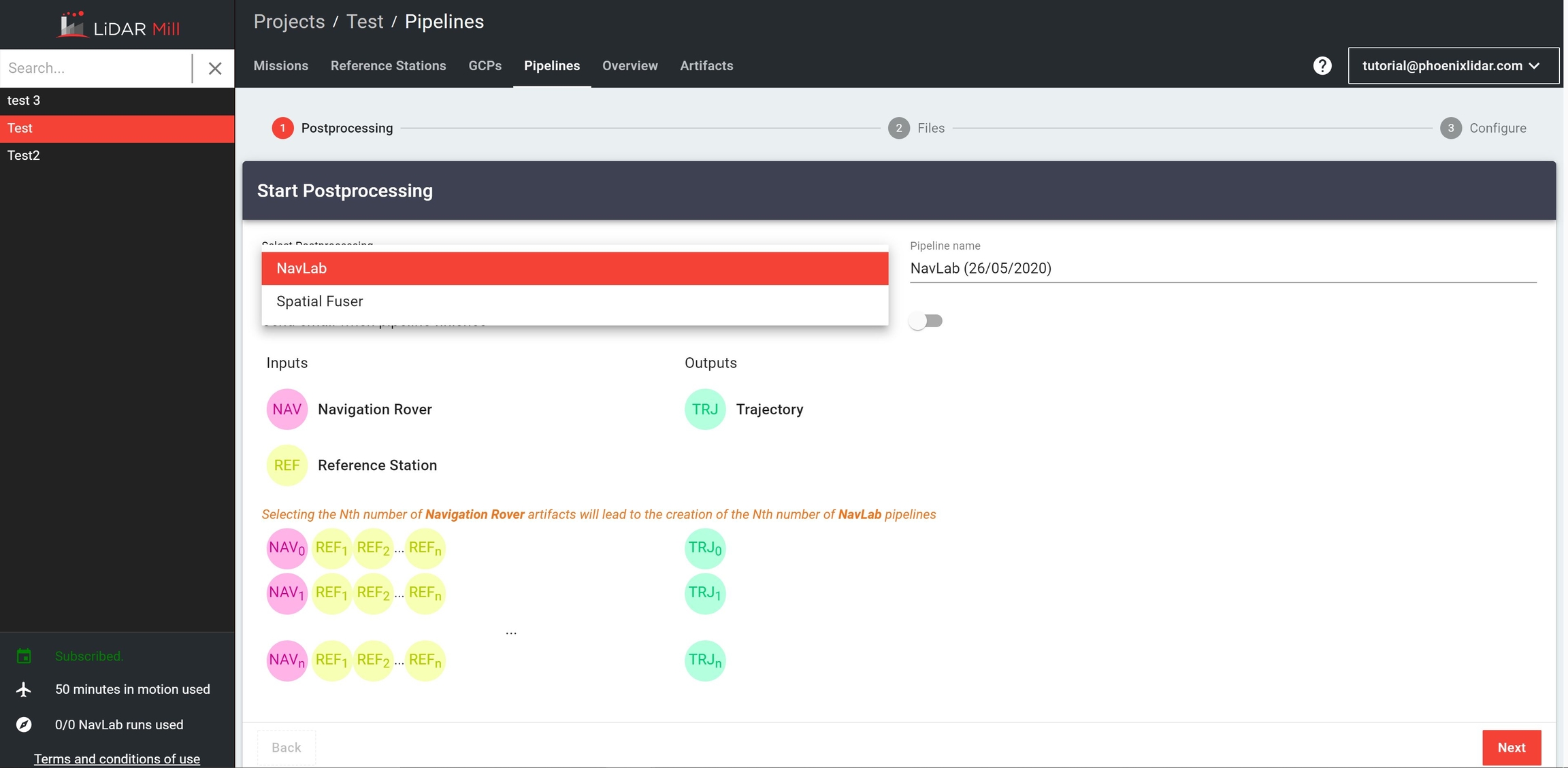 To begin processing your trajectory data, create a NavLab Pipeline by navigating to the Pipelines tab. Under Select Processing, choose "Navlab". LiDARMill indicates the types of input files required, and the type of output file that it will create. Click "Next" to move forward.