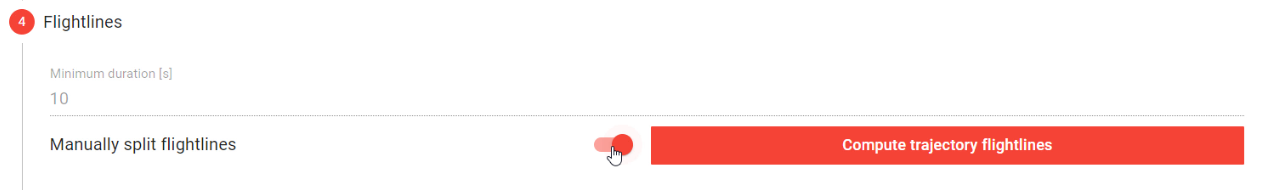 Manually split flightlines: Enable this tool and then click the "Compute trajectory flightlines" button to specify which flightlines should be included in the generated pointcloud