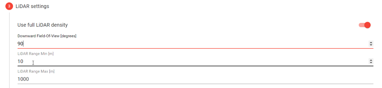 Configure the desired Downward Field-of-View in degrees (90 recommended for aerial acquisitions), as well as the desired LiDAR Range from sensor (Min/Max in meters), to be included in the generated pointcloud.