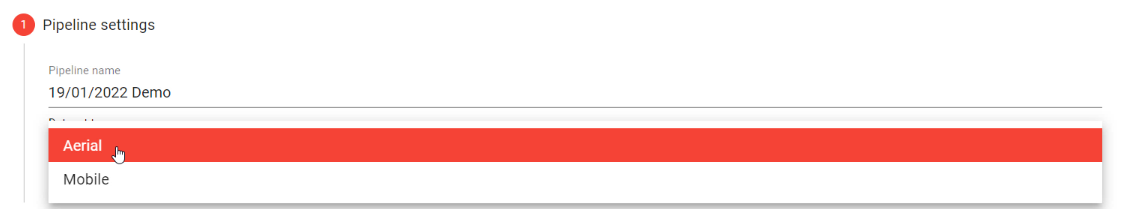 Specify the Pipeline name and configure the Dataset type (Aerial or Mobile) to optimize processing