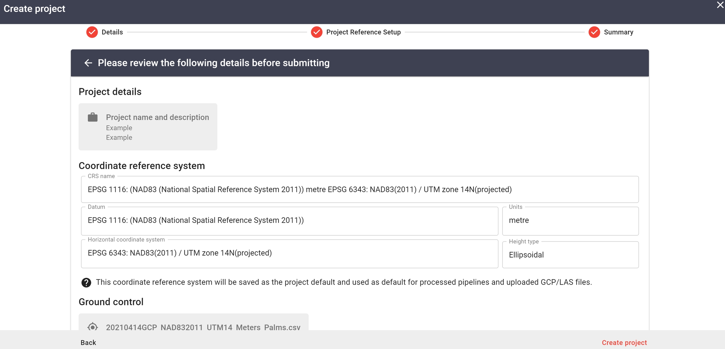 Review the project details and coordinate reference system configuration under the "Summary" tab. Click "Create Project" to create the project.