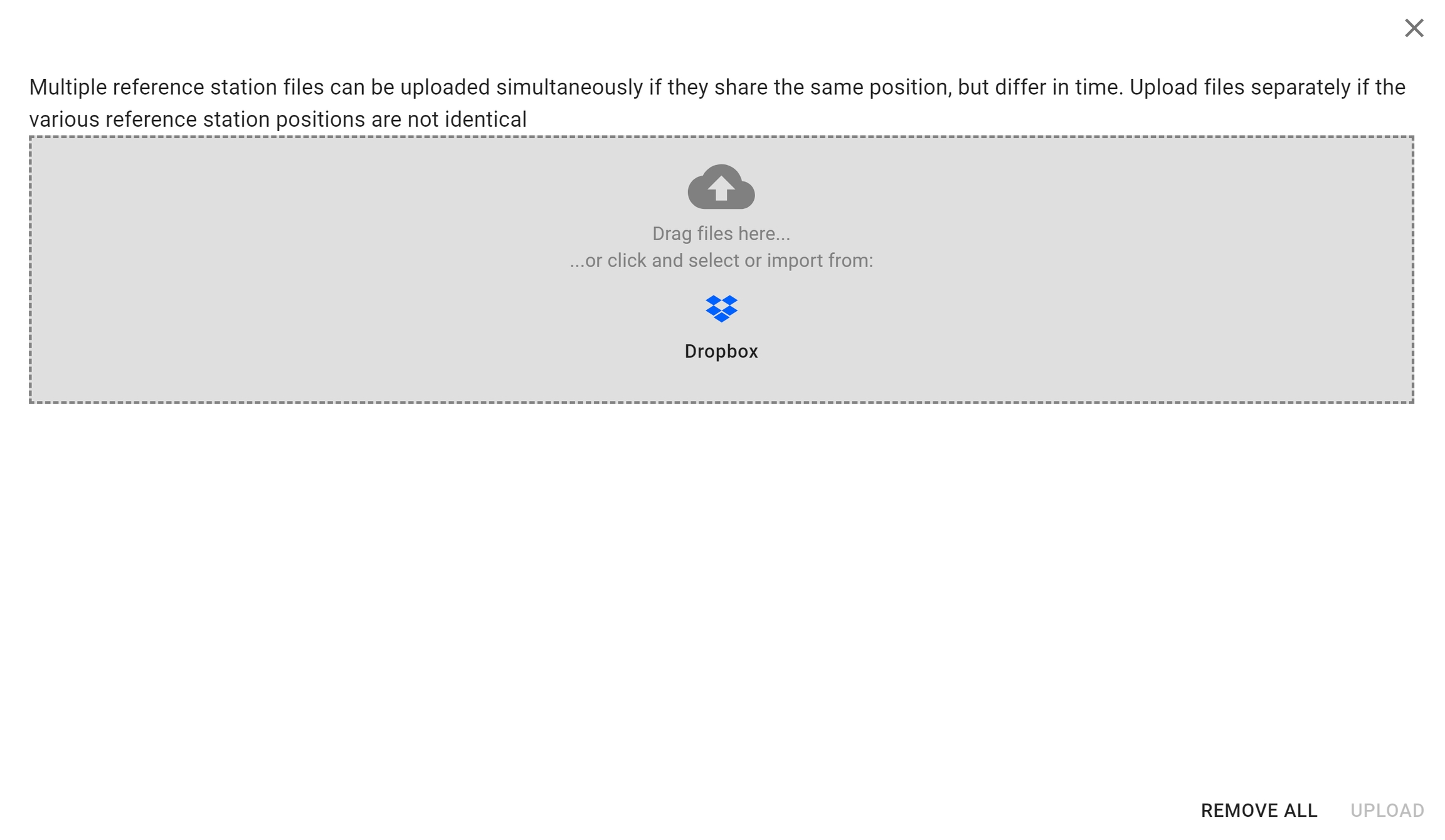 Multiple reference station files can be uploaded simultaneously if they share the same position, but differ in time. Upload files separately if the various reference station positions are not identical.