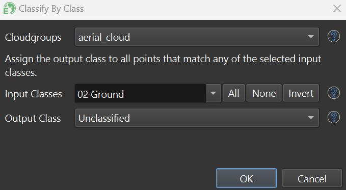 **Classify By Class** moves all points contained in the list of **Input Classes** and reassigns them to the **Output Class**. In the example below, all points in class 02 (Ground), will be reassigned to the 01 (Unclassified) class: