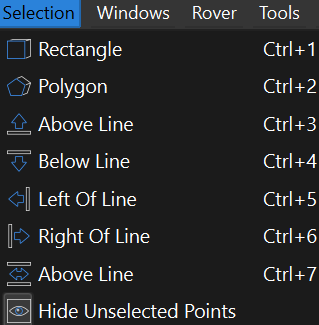 Selects points contained inside a polygon. Left click button to activate, then left click to create an initial vertex of polygon. Continue adding vertices by left clicking, then left click on the initial vertex to finalize the polygon.