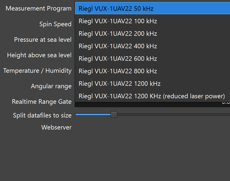 **Measurement Program** can be selected from a list of different measurement programs. Measurement program dictates pulse repetition rate (in kHz), which in turn dictates max effective range: