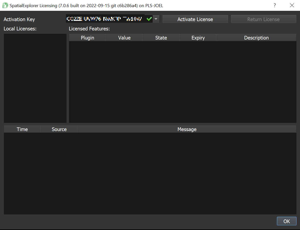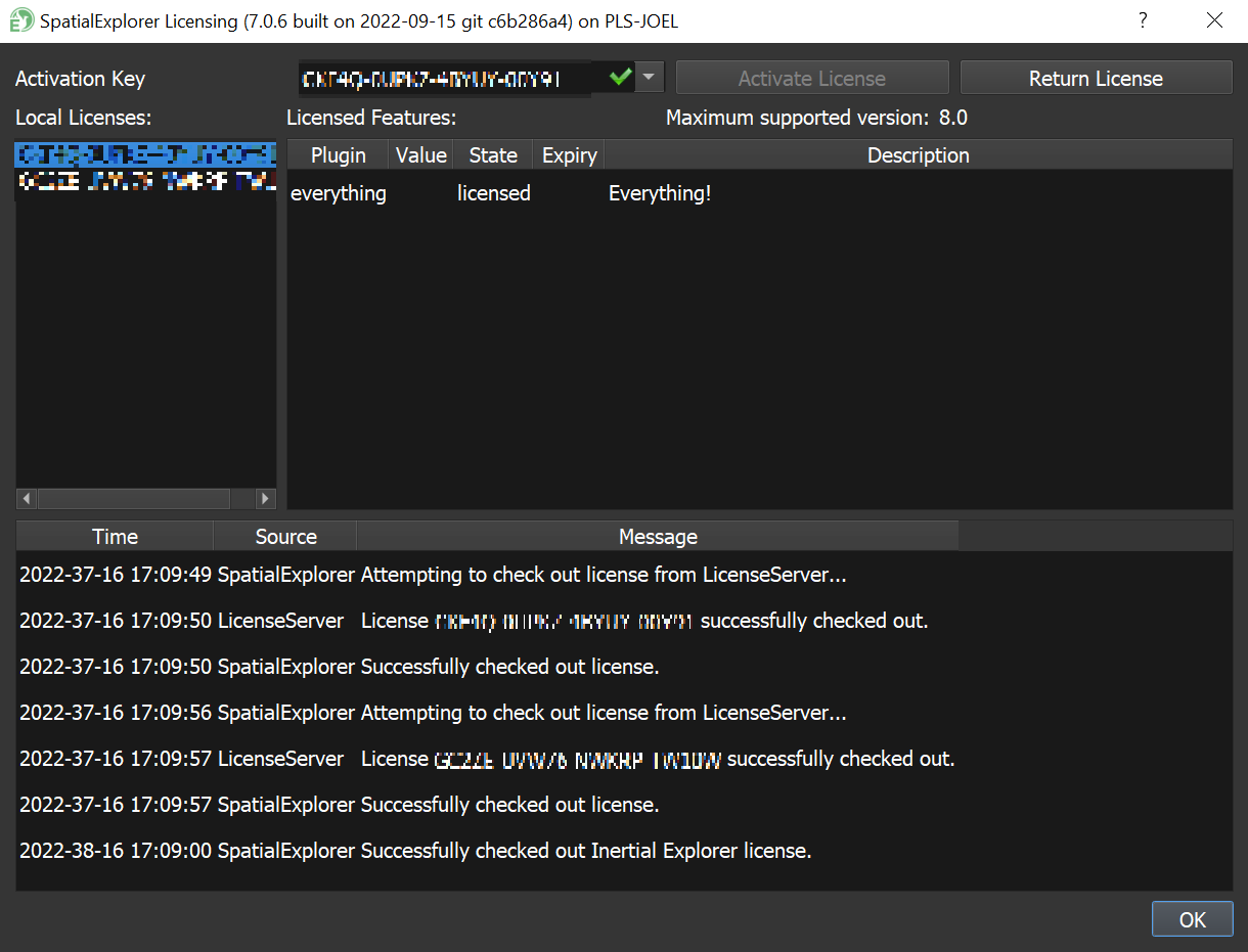 The license keys for use in SpatialExplorer will have a red 'SE' next to them in the 'License keys' column. These can be copied and pasted into the Licensing window in SpatialExplorer as shown at the top of this page.