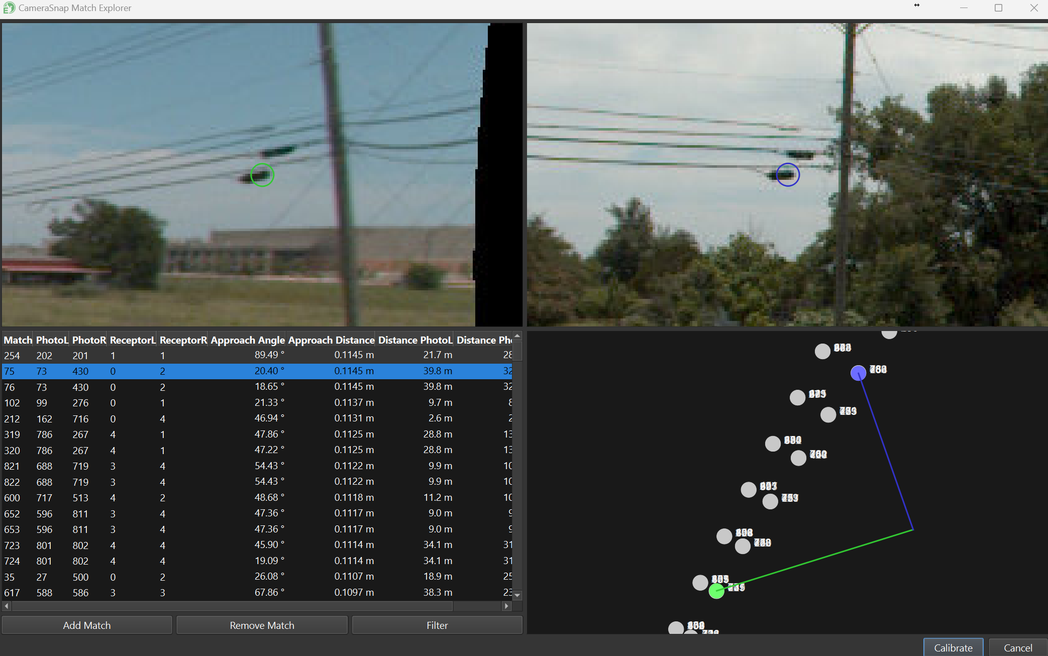 Try to retain at least 20 matches, however ideally you have much more. Once you have filtered the matches, you can click **Calibrate** and CameraSnap will proceed with Calibration using the available feature matches. Review the [CameraSnap report](https://docs.phoenixlidar.com/spatialexplorer-8-and-9/user-interface/toolbars/workflow/camera-snap/camerasnap-reports) to ensure a proper calibration was achieved.&#x20;