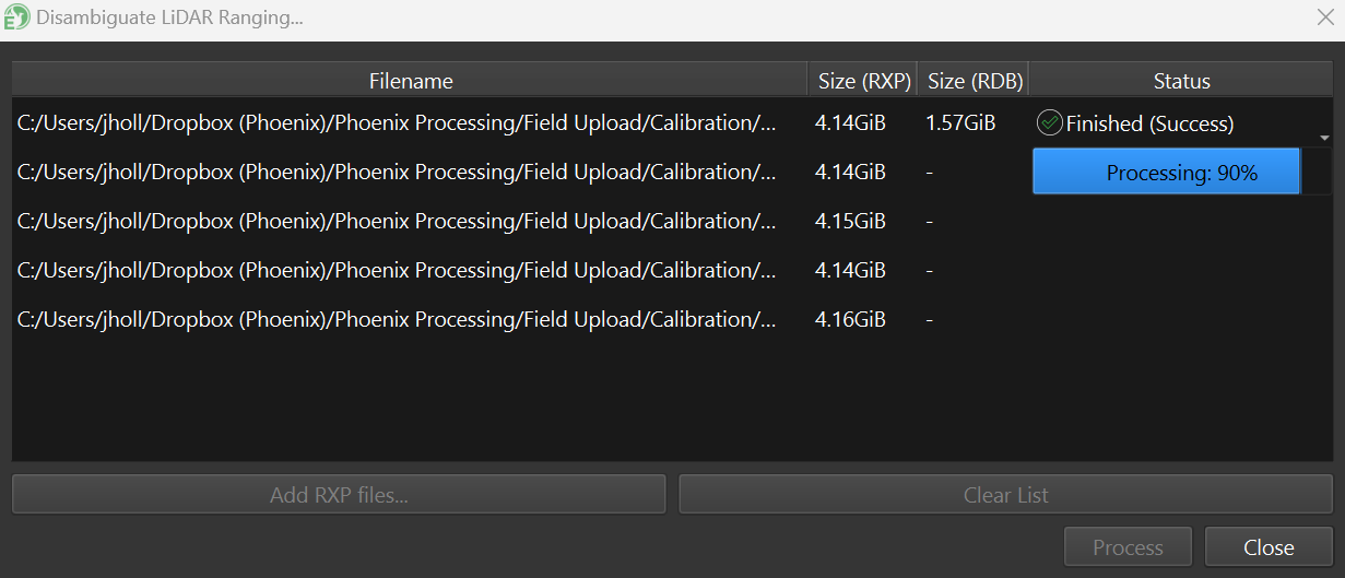 Add the RXP files from your project folder and click Process: