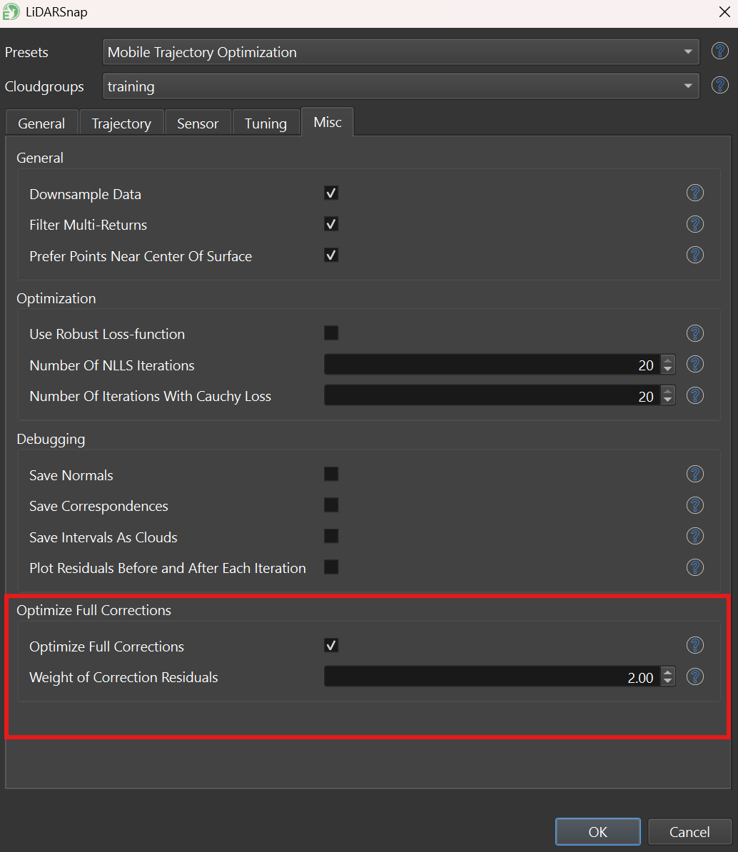 The **Weight of Correction Residuals** depends on the data set. Cloud-to-cloud observations also influence LiDARSnap during optimization, so it may be necessary to increase the **Weight of Correction Residuals** when many cloud-to-cloud observations are present (dense urban areas). Start with a lower weight (e.g. 2 - 10), and increase the weight (e.g. 20-100), if necessary.&#x20;