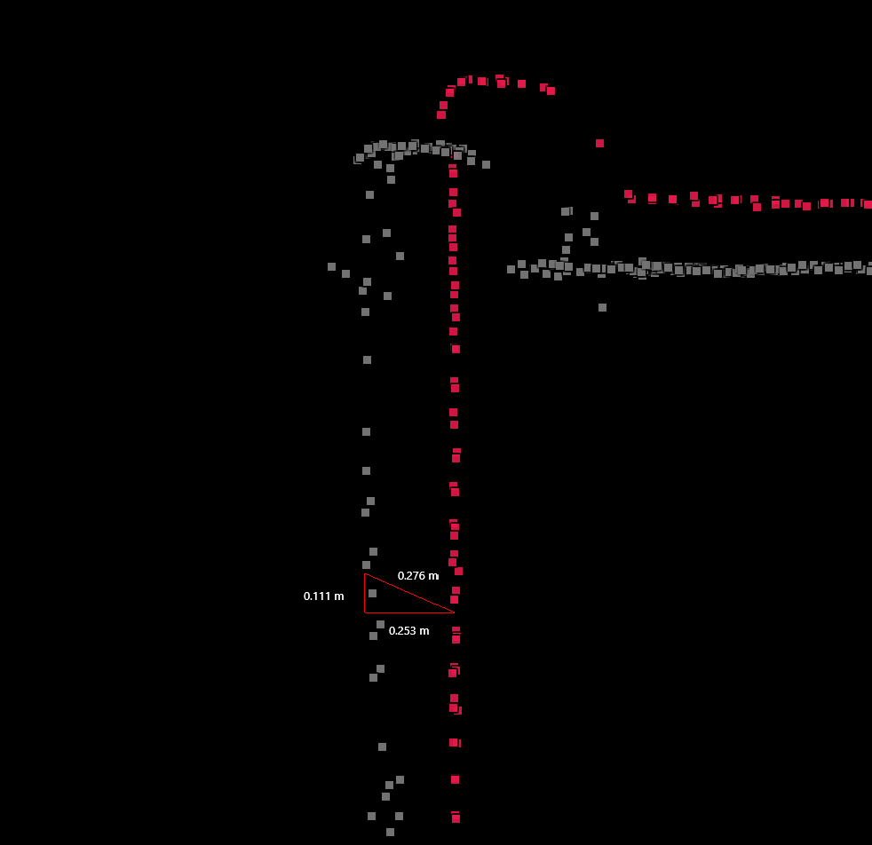 A residual is the distance between the two surfaces in a correspondence. LiDARSnap's goal is to reduce residuals. In the example above, where a correspondence is detected on a wall, the pre-optimization residual would be about 25 cm: