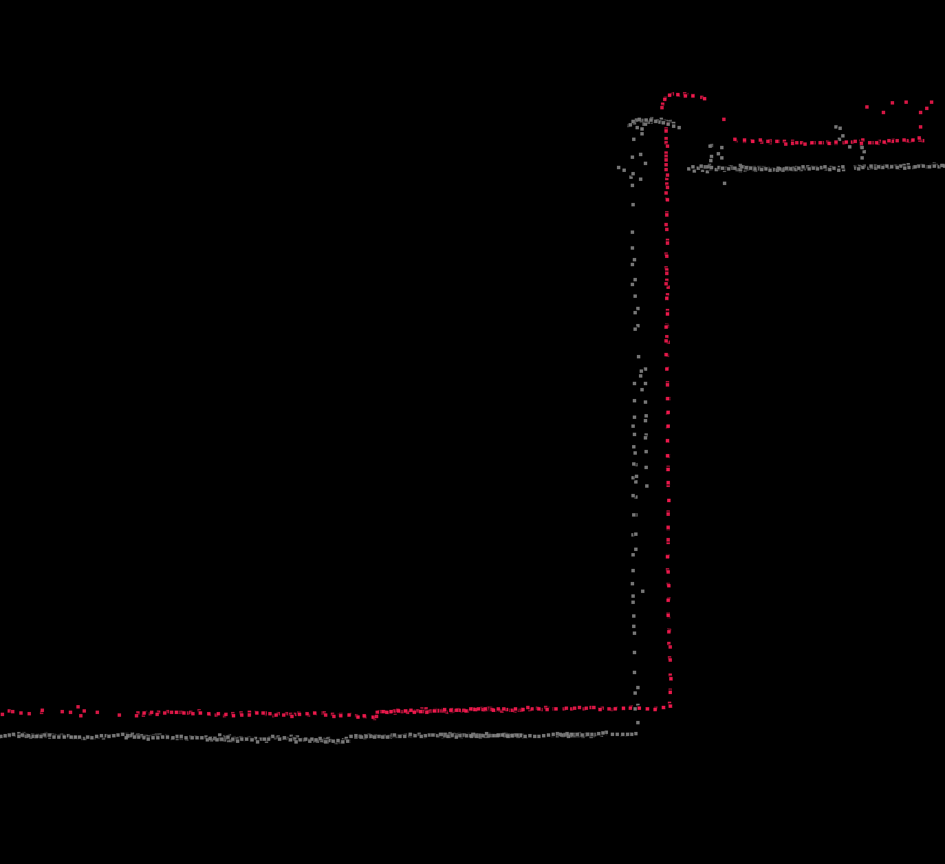 Ex. 1: A pointcloud is visualized by interval (flightline). Two intervals overlap on the same wall. LiDARSnap would likely identify at least two correspondences (one for the ground surface, and one for the wall surface):
