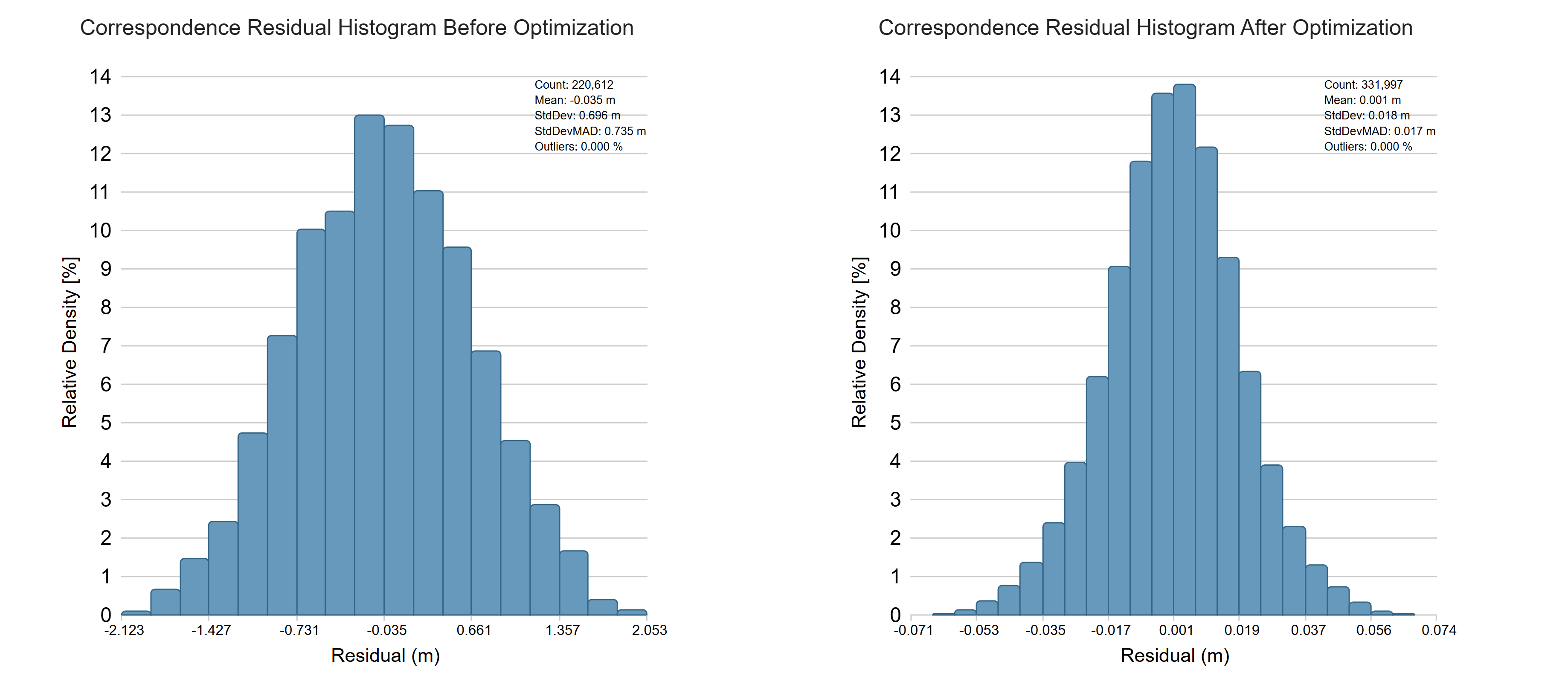 The LiDARSnap report shows histogram distributions of residuals before (left) and after (right) optimization: