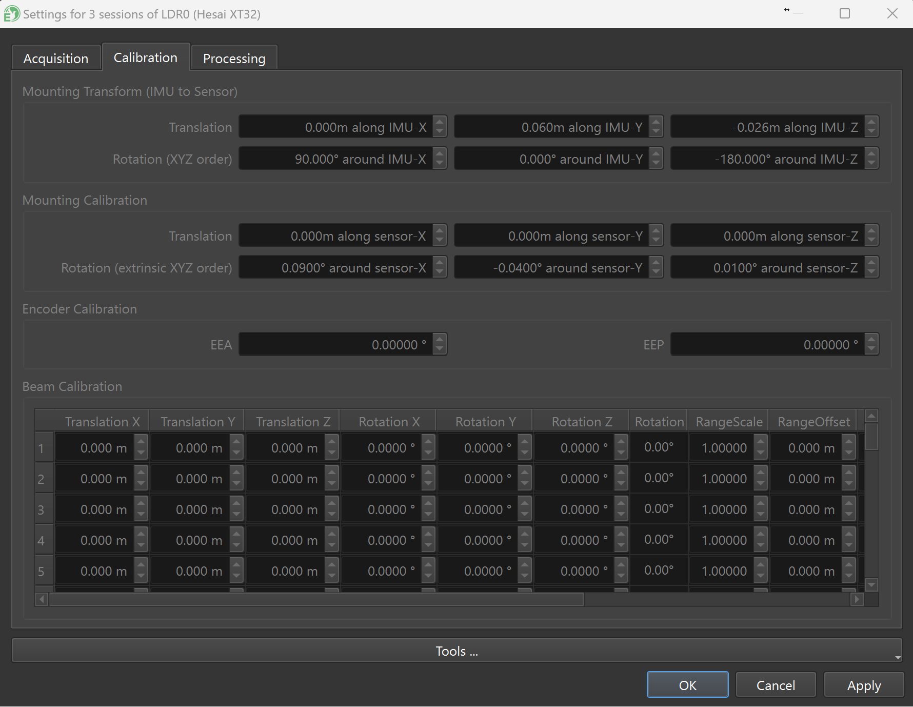 <figure><img src="https://2222094320-files.gitbook.io/~/files/v0/b/gitbook-x-prod.appspot.com/o/spaces%2FdEevfLZRIk38LUPwDa4V%2Fuploads%2F2AHrKFrzwvjZlmRr04N2%2Fimage.png?alt=media&#x26;token=dbd41f06-f200-4e1b-9215-d17f3f32c717" alt=""><figcaption><p>Generalized values from mechanical drawings are shown under the Mounting Transform section, and system-specific calibration values are shown in the Mounting Calibration section. Note that calibrated translation values are not present in the Mounting Calibration section, as translations are not typically calibrated.</p></figcaption></figure>