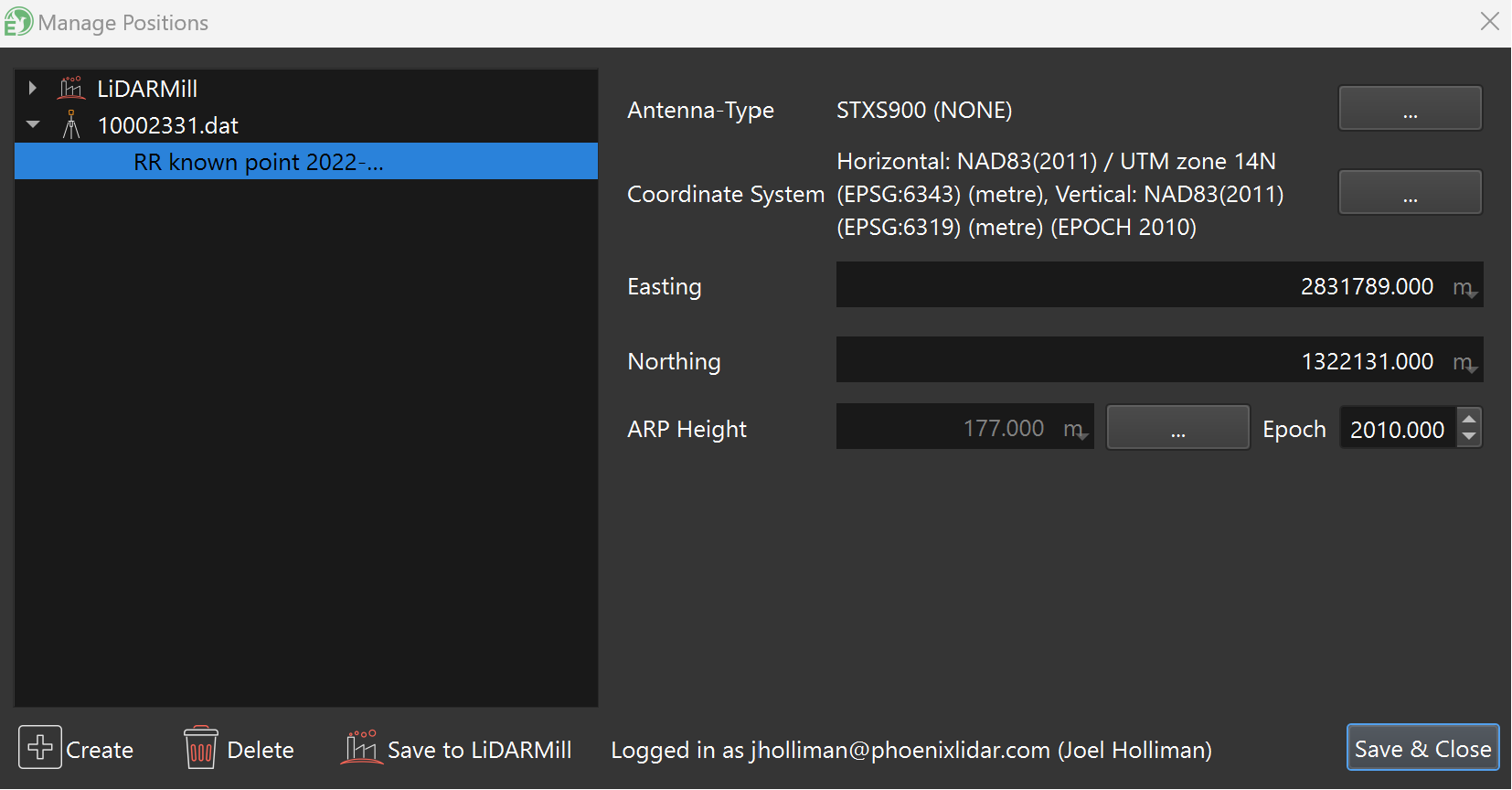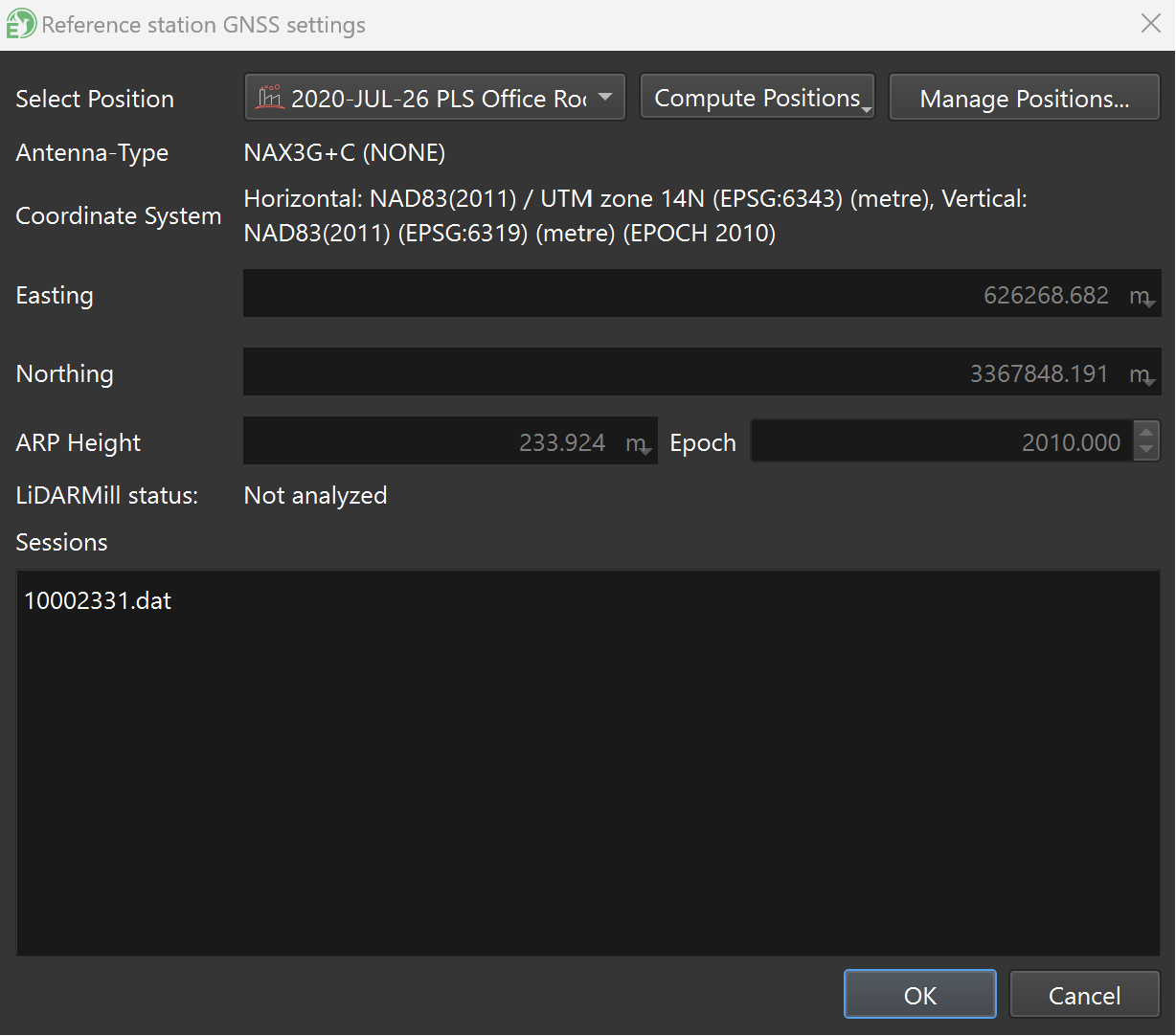 Once the reference station is imported, configure the position by double clicking the reference station file in the project window.  If you are logged into your LiDARMill account, you can select a position from one of the positions saved to your LiDARMill account: