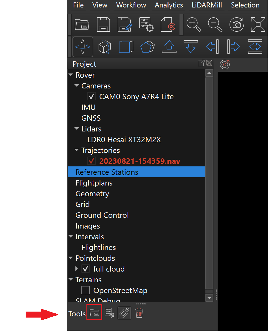 Reference stations are used with NavLab Embedded to achieve the highest level of positioning accuracy. To import a reference station, navigate to **Reference Stations** in the project window and select the **File Open** icon: