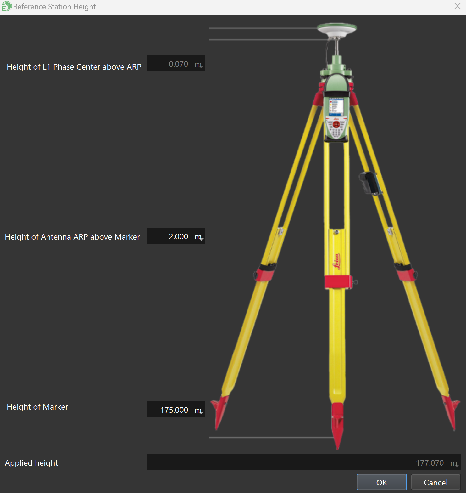Enter the elevation of the reference station in the **ARP Height** field. Enter the position under the **Height of Marker** field. If you know the **Height of Antenna ARP above Marker**, enter that accordingly. **Height of L1 Phase Center above ARP** will automatically populate based on the antenna type that you selected.&#x20;